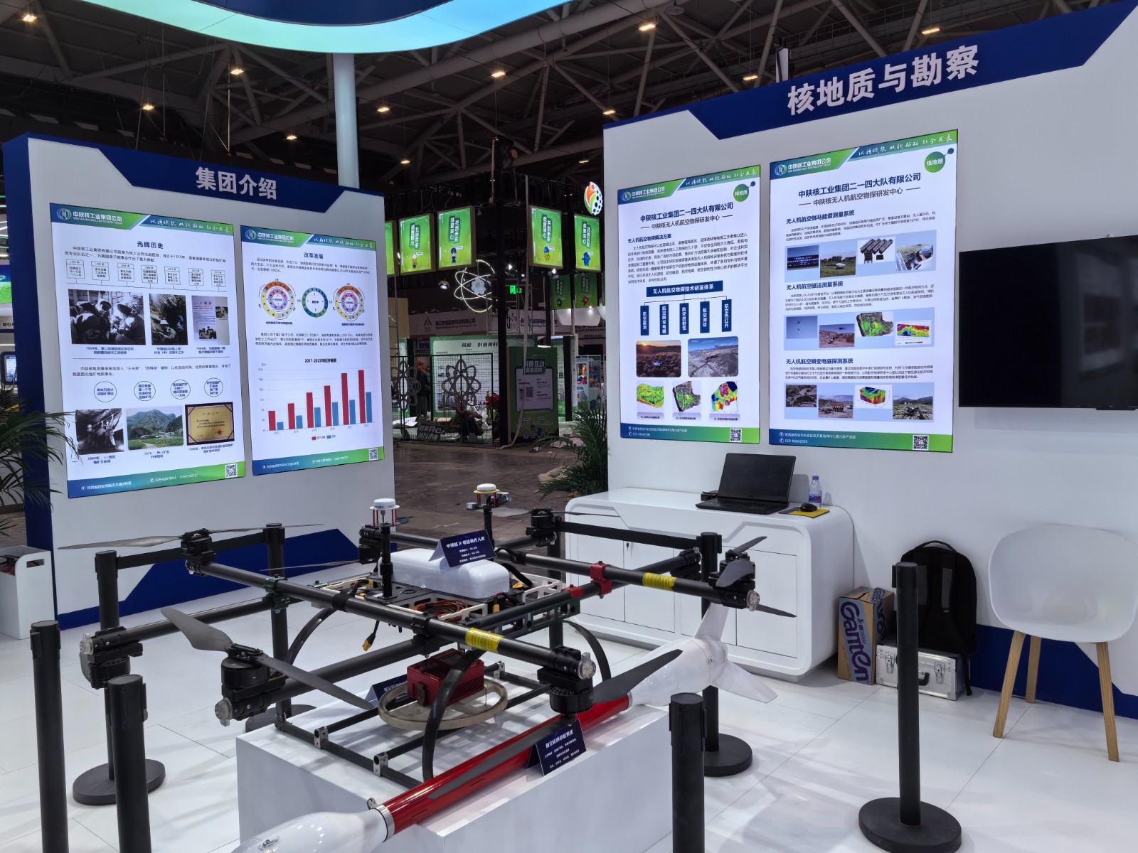 中陜核工業集團二一四大隊有限公司作為中陜核集團核地質與勘查板塊的代表單位參展。公司以無人機航空物探技術為特色,重點展示了無人機航空伽馬能譜測量系統、航磁探測系統以及航空瞬變電磁系統。展會期間,同時參加了本次大會的多個專題論壇,與國內眾多同行單位進行了深入交流與探討。