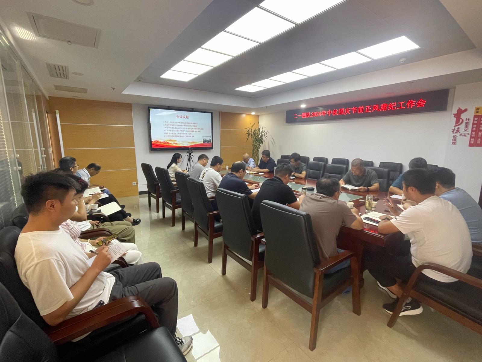 會議學習了《習近平關于嚴明黨的紀律和規矩論述摘編》;傳達了集團公司紀委2024年中秋國慶廉潔過節提醒;通報了省紀委辦公廳關于5起違規吃喝典型案例;集中學習了中國紀檢監察報《緊盯“四風”新動向 增強監督穿透力》評論文章;集體觀看了廉政教育片《堅持受賄行賄一起查》;安排部署了公司中秋國慶期間正風肅紀相關工作及要求。