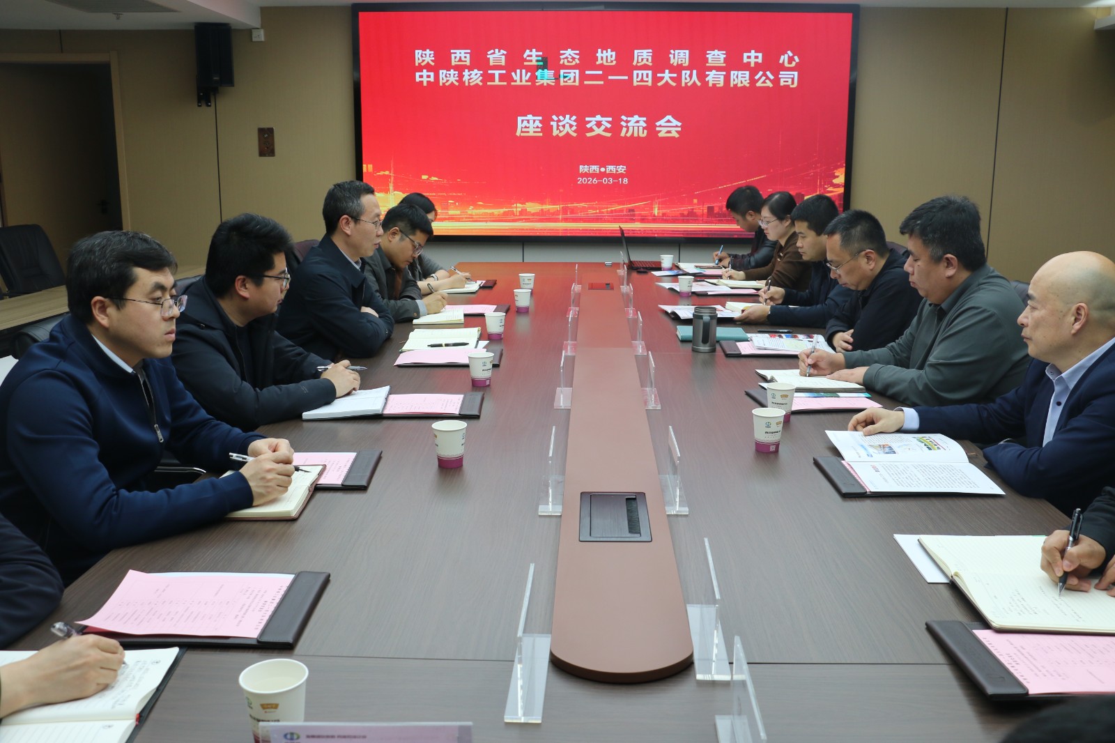 3月18日下午,陜西省生態(tài)地質(zhì)調(diào)查中心與中陜核工業(yè)集團(tuán)二一四大隊(duì)有限公司開展專題調(diào)研座談會(huì),聚焦生態(tài)地質(zhì)技術(shù)創(chuàng)新、項(xiàng)目協(xié)同推進(jìn)、成果轉(zhuǎn)化應(yīng)用等重點(diǎn)議題深入交流。省生態(tài)地質(zhì)調(diào)查中心黨總支書記、主任薛旭平,總工程師何元方;二一四隊(duì)黨委書記、董事長付星,黨委委員、總經(jīng)理王朋參加會(huì)議。
