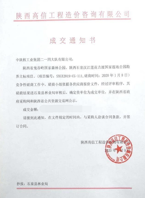 2020年1月9日,從陜西省政府采購網(wǎng)獲悉,公司成功中標(biāo)“陜西省鬼谷嶺國家森林公園、陜西石泉漢江蓮花古渡國家濕地公園勘界立標(biāo)項目”。