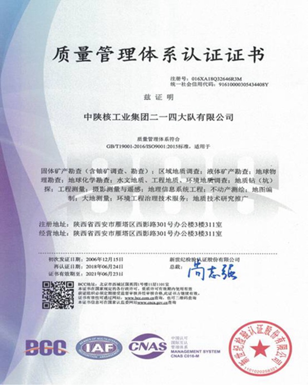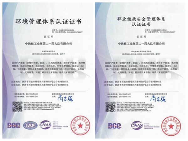 通過質量管理體系再認證和標準轉版審核、環境和職業健康安全管理體系的審核,在固體礦產勘查(含鈾礦調查、勘查);區域地質調查;液體礦產勘查;地球物理勘查;地球化學勘查;水文地質、工程地質、環境地質調查;地質鉆(坑)探;工程測量;攝影測量與遙感;地球信息系統工程;不動產測繪;地圖編制;大地測量;環境工程治理技術服務等方面通過ISO9001:2015版質量管理體系證書、ISO14001:2015版環境管理體系證書、OHSAS 18001:2007版職業健康安全管理體系認證,獲得ISO9001:2015版質量管理體系證書、ISO14001:2015版環境管理體系證書、OHSAS 18001:2007版職業健康安全管理體系認證證書及標志使用授權書。