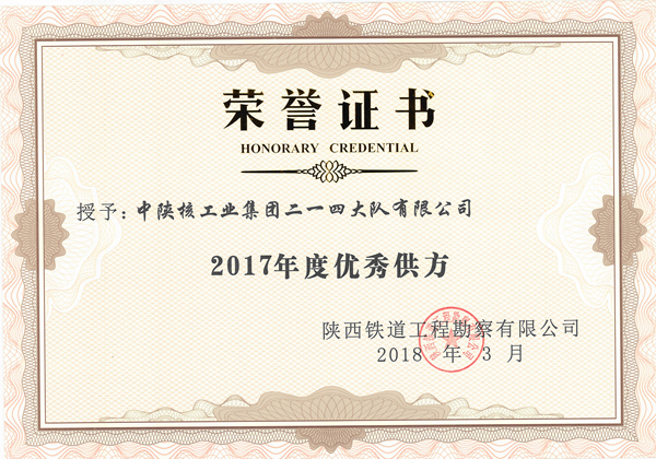 2018年3月28日,陜西鐵道工程勘察有限公司召開2017年度供方座談會,公司中陜核集團物化探研究院代表公司參會并進行了《AMT方法在鐵路勘察中的應用》的專題交流發言,經過專家評比從112家供方企業中勝出,榮獲陜西鐵道工程勘察有限公司2017年度優秀供方榮譽。