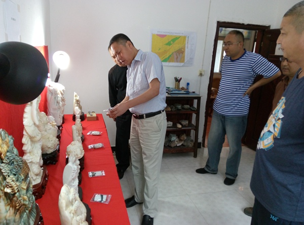 就漢白玉開發(fā)和利用,項(xiàng)目組加工制作了漢白玉工藝品,田社生仔細(xì)的觀察每一件擺件,并不時(shí)的拿出玉石手電筒照看,查看玉雕件的透度,并與在場的項(xiàng)目組人員交流,詳細(xì)的詢問了漢白玉礦體的有關(guān)情況。