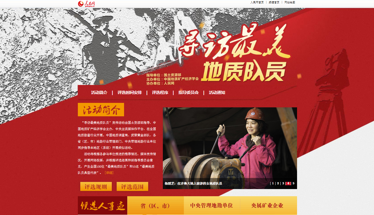 由國土資源部指導,中國地質礦產經濟學會主辦,組織廣大新聞媒體開展“尋訪最美地質隊員”大型宣傳活動,在全國地質勘查行業開展,通過自下而上推選、網絡初選、專家評選方式,最終評選出100名“最美地質隊員”和10名“最美地質隊員典型代表”。