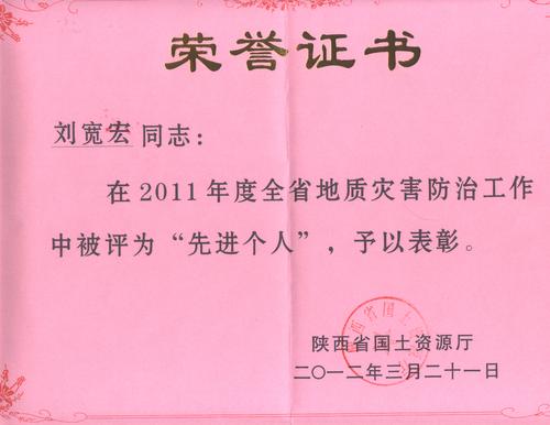 近日,大隊被陜西省國土資源廳評為2011年度全省地質災害防治工作先進單位,劉寬宏同志榮獲先進個人稱號。