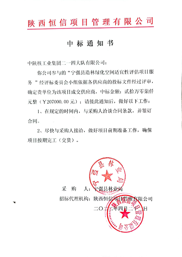 近日,接招標(biāo)代理機構(gòu)成交通知書,公司成功中標(biāo)《寧強縣造林綠化空間適宜性評估項目》。